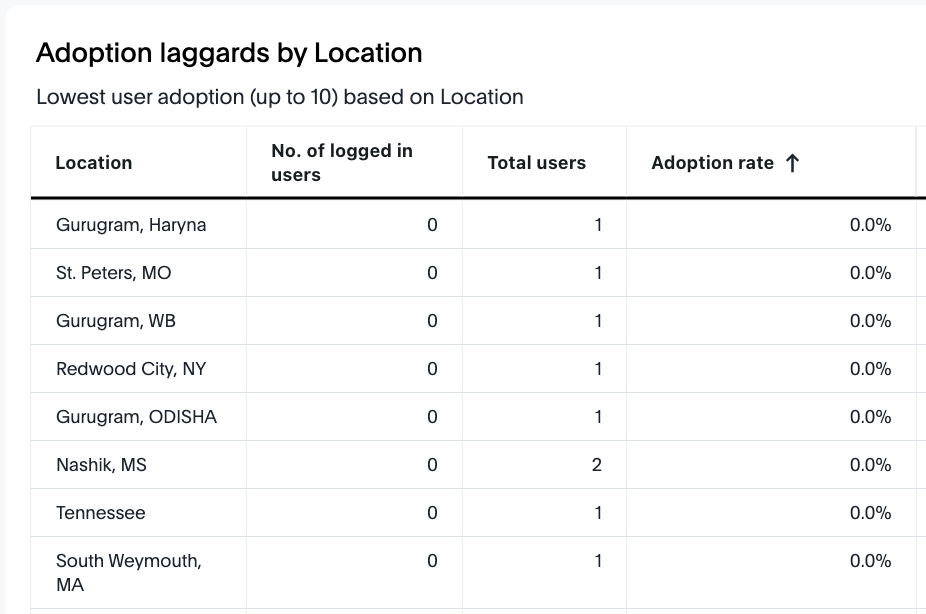 This table identifies the “user parameters” (location/department/segment etc that is available as a drop down option to select at the top filter panel) with the lowest user adoption rates (up to 10), based on the percentage of total users who logged in during the selected period. Each row lists a location and the relevant adoption details.
